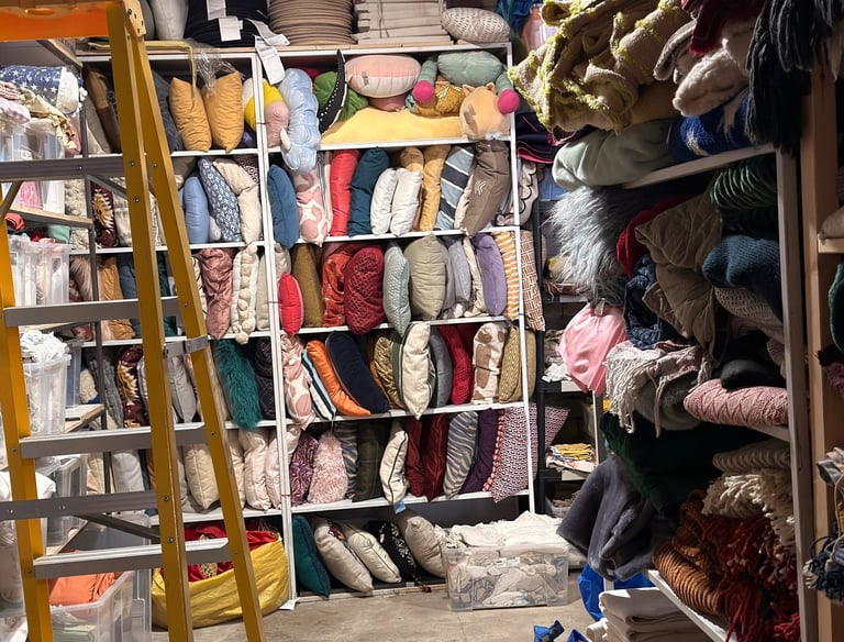 600 kv. m. sandėlyje atrasite įvairius dekoratyvinius elementus, baldus, indus, apšvietimą, įvairią tekstilę – nuo pagalvėlių iki kilimų, buitinę techniką, dirbtines gėles, paveikslus ir dar daugiau.